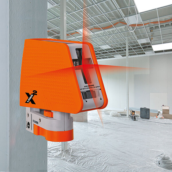 The laser points are arranged in an exact right angle to one another. The horizontal laser points are all at one height. Ideal for rapid horizontal levelling, vertical alignment, plumbing and for marking off right angles jobs.