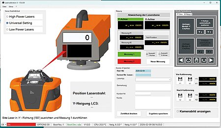 Für eine einfache Inbetriebnahme verfügt die LaserCalibration3 über einen justierbaren Dreifuß mit 5/8“ Anschlussgewinde und eine USB-Schnittstelle zum Anschluss an einen PC mit Windows 10 oder höher. Die auf einem USB-Stick mitgelieferte Software kann ohne Installation sofort auf dem PC ausgeführt werden.
