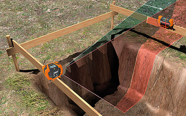 Auf der gegenüberliegenden Seite des Schnurgerüsts wird der Laserempfänger COMMANDER 3 mit dem Halteklammer positioniert. Mit Hilfe der AutoAlign-Funktion richtet sich der Rotationslaser PRIMUS 3 HVA / HVA2N dann automatisch auf den COMMANDER 3 aus. Außerdem wird durch die AutoAlign-Funktion die Strahlrichtung ständig überwacht und, wenn notwendig, automatisch nachgeführt.
